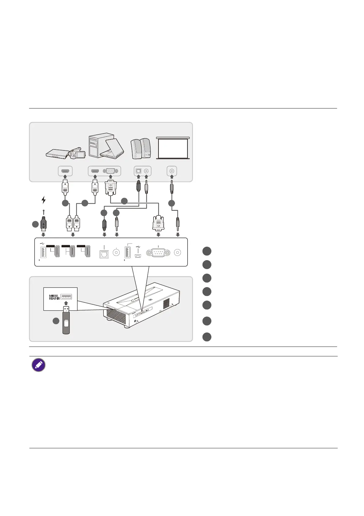 • The connection illustrations are for reference only. The rear connecting jacks available on the projector