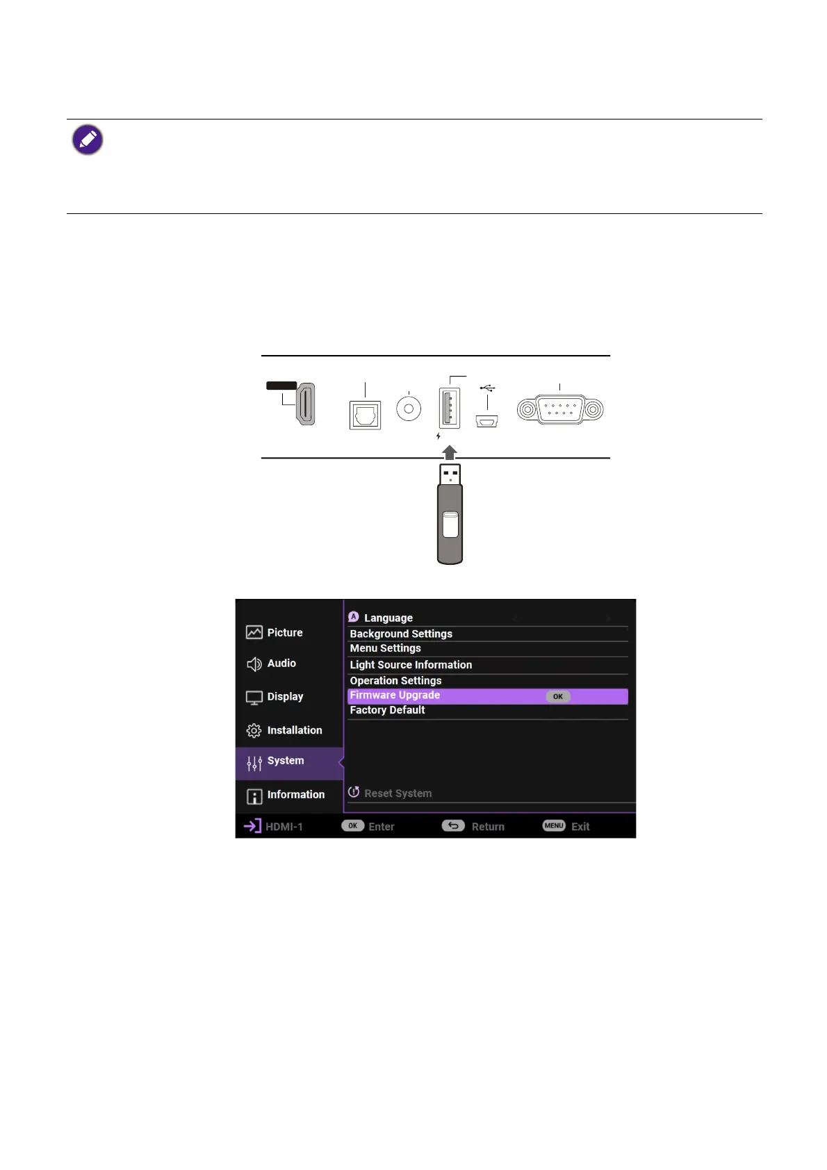 4. Go to the Advanced menu > System > Firmware Upgrade menu, and press OK.
