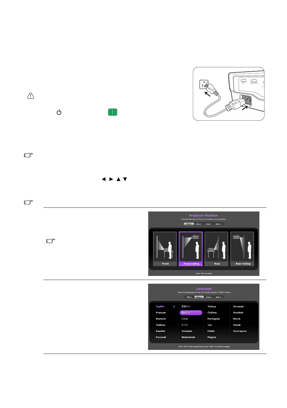 3. If this is the first time you turn on the projector, the setup wizard appears to guide you through