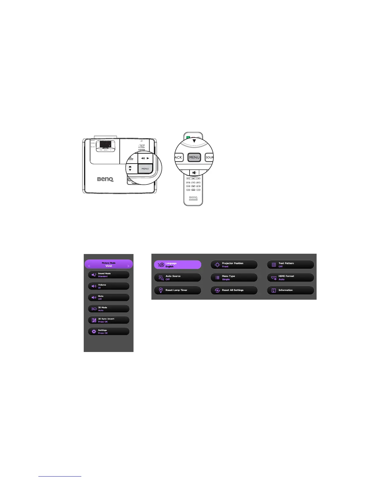 To access the OSD menu, press MENU on the projector or remote control.