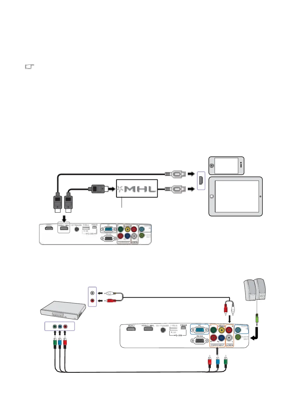The projector can display contents directly from an MHL compatible smart device. Using an HDMI to