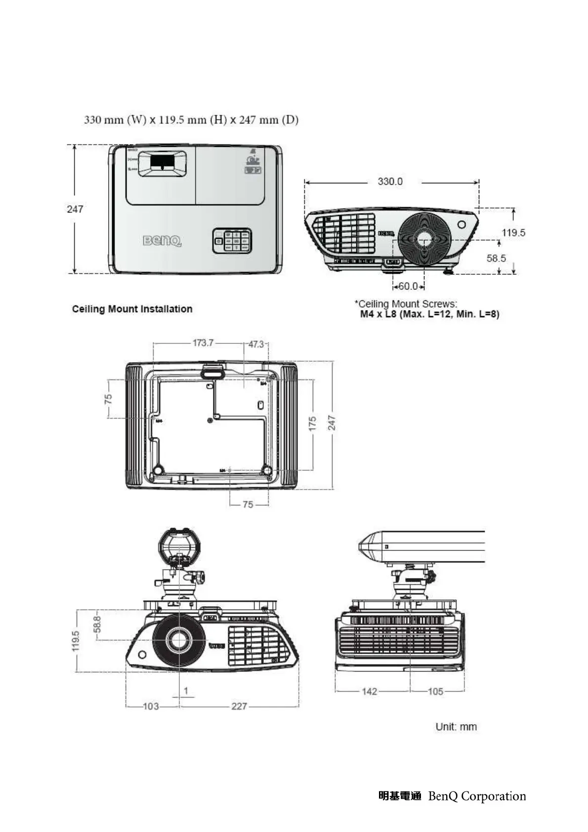 BenQ W700 - Appendix 3: Ceiling Mount Drawing