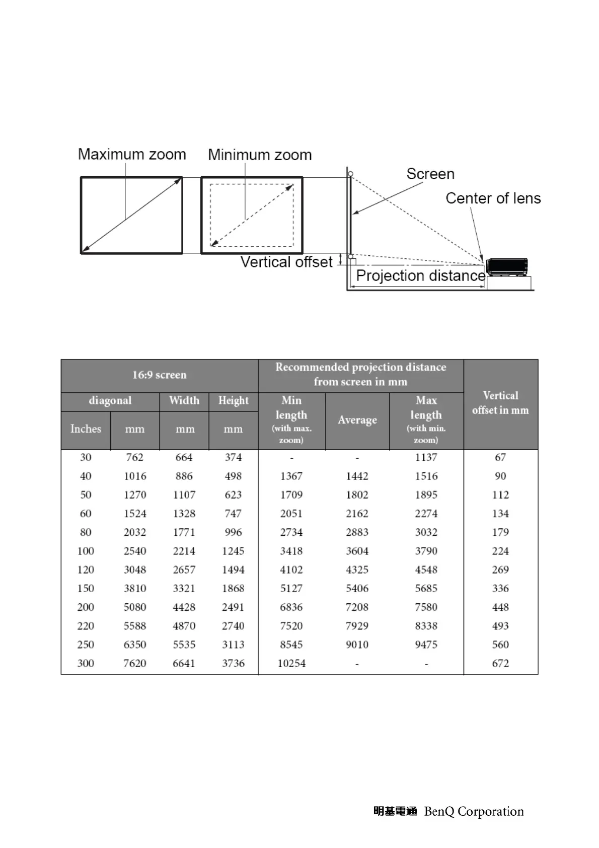 BenQ W700 - Projection and Keystone Adjustments; Projection Dimensions and Distances