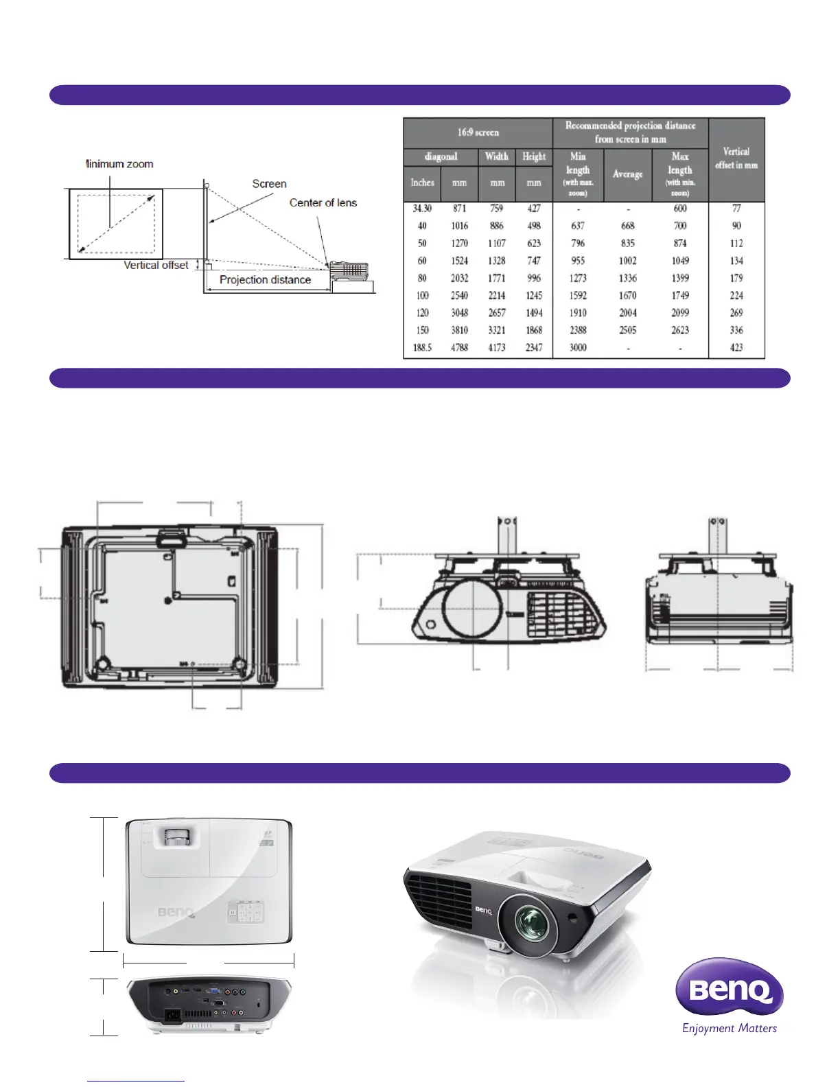 BenQ W710ST - Projection Distance Chart; Ceiling Mount Screw Specification; Projector Dimensions