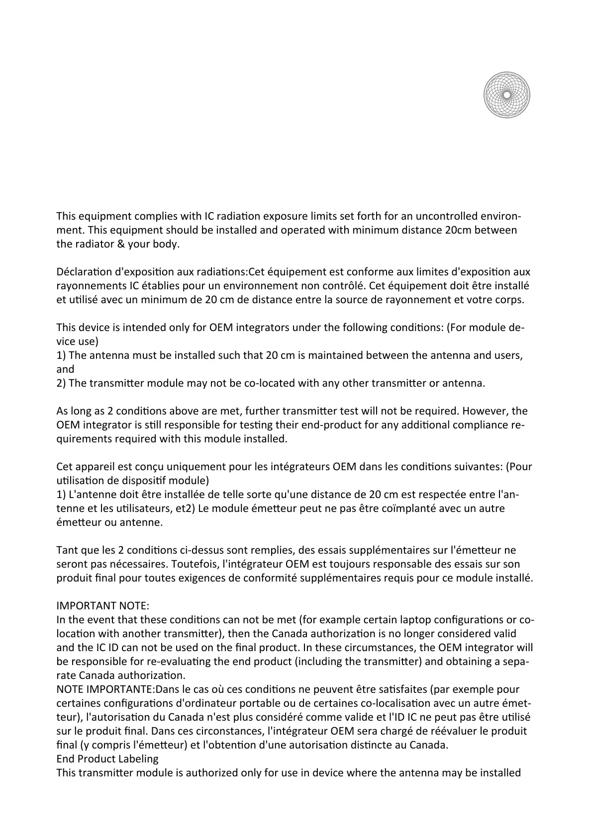 l'intégrateur OEM sera chargé de réévaluer le produit final (y compris l'émetteur) et l'obtention d'une autorisation