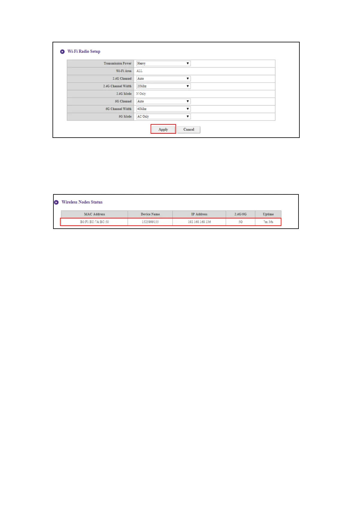 The Wireless Nodes Status sub-menu lists all the devices connected to the Host via Wi-Fi