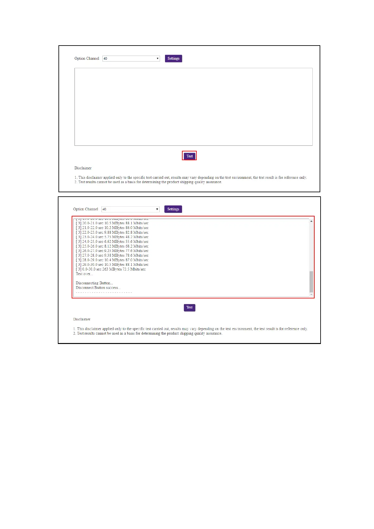 3. Click the Te s t button. The results of the test will be shown in the main window.