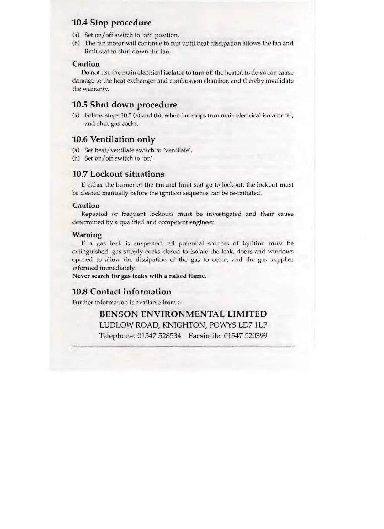 BENSON OLYMPIC WH - Stop Procedure; Shutdown Procedure; Lockout Situations; Contact Information