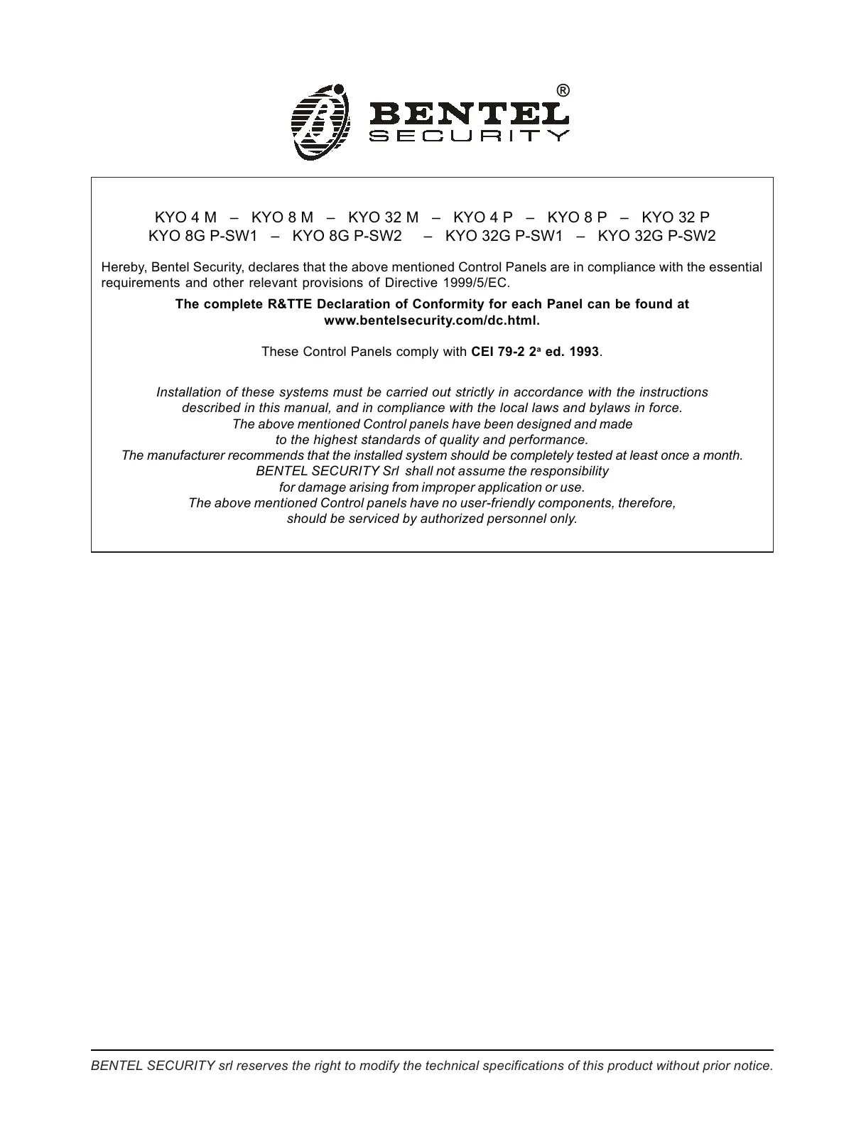 Hereby, Bentel Security, declares that the above mentioned Control Panels are in compliance with the essential