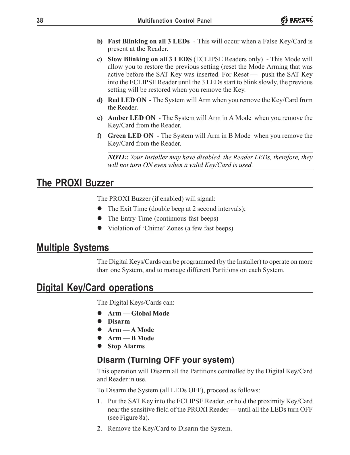 To Disarm the System (all LEDs OFF), proceed as follows: