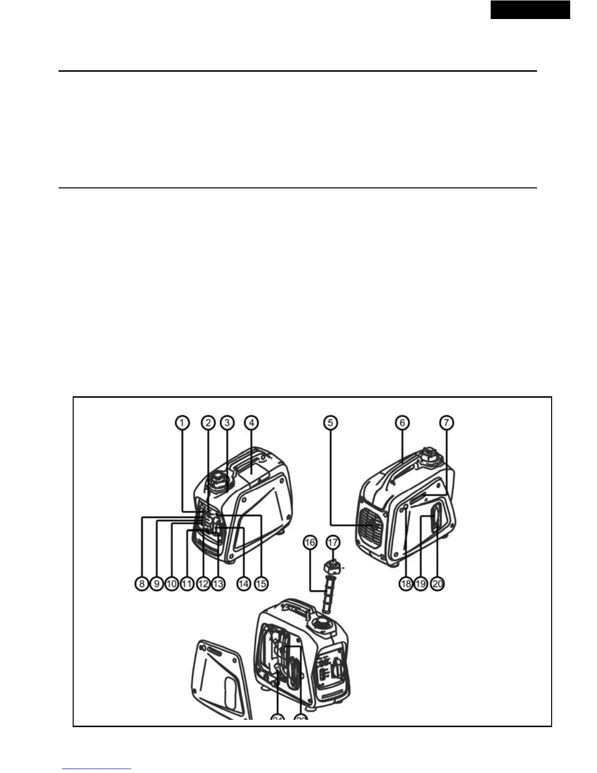 (19) Alavanca de partida (20)Torneira de alimentação (21)Tampa do reservatório de óleo