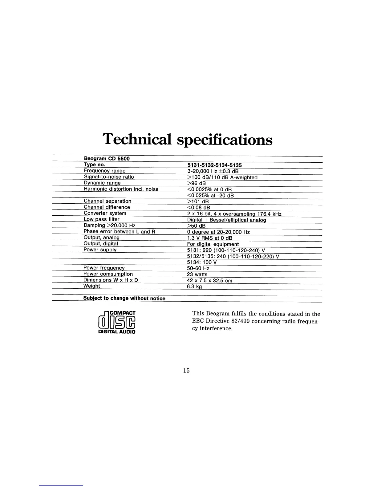 Beogram CD 5500 - Beogram CD 5500 Technical Specifications