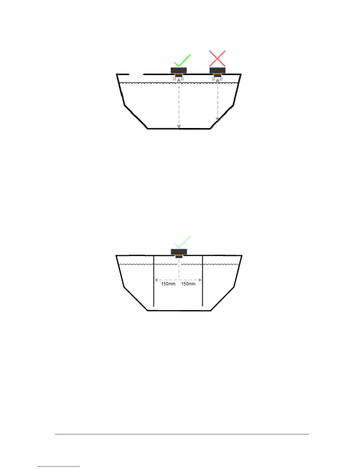 TS1 must be mounted at least 150mm from a vertical tank baffle, tank walls and piping.