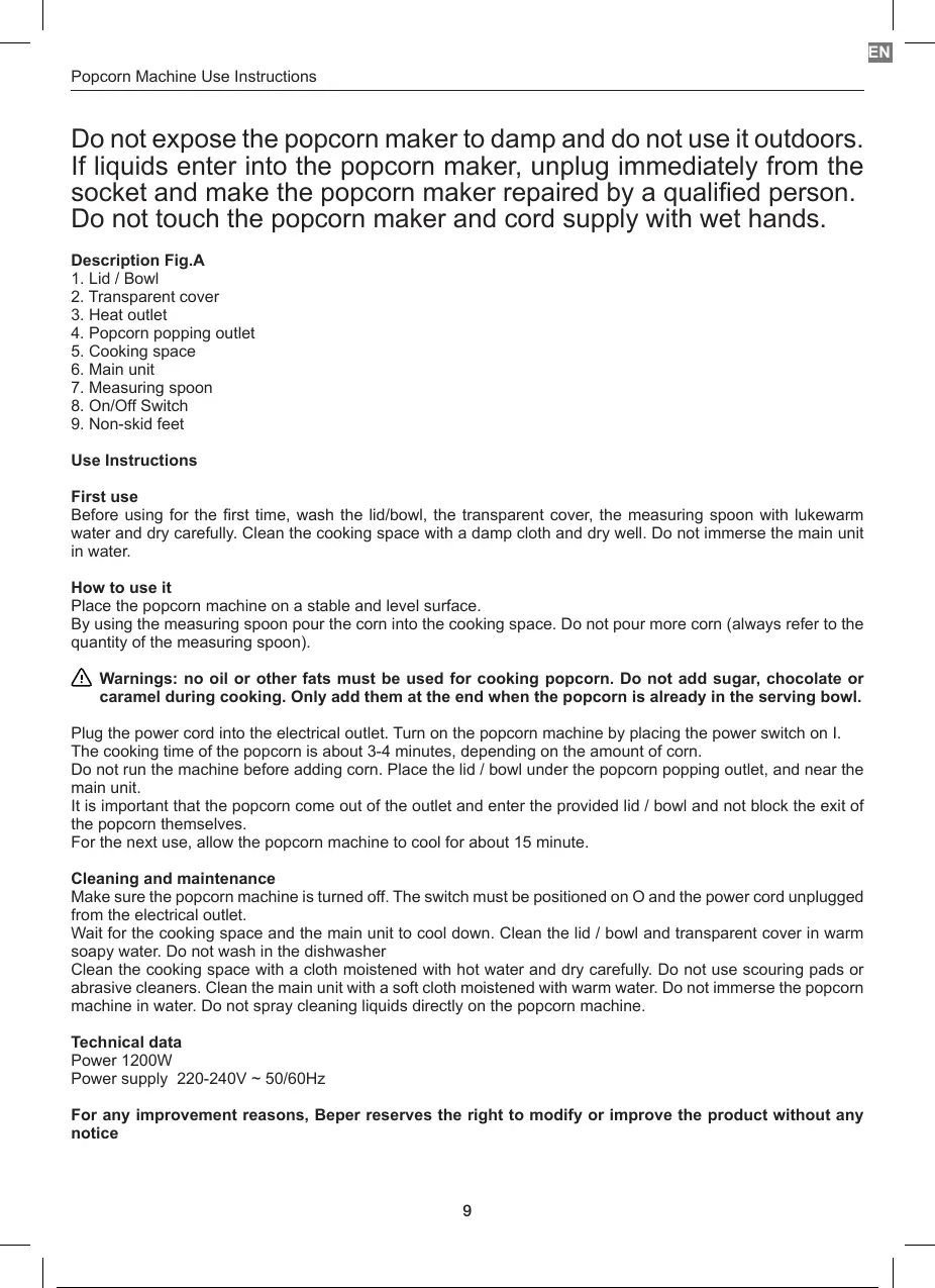 Do not expose the popcorn maker to damp and do not use it outdoors.