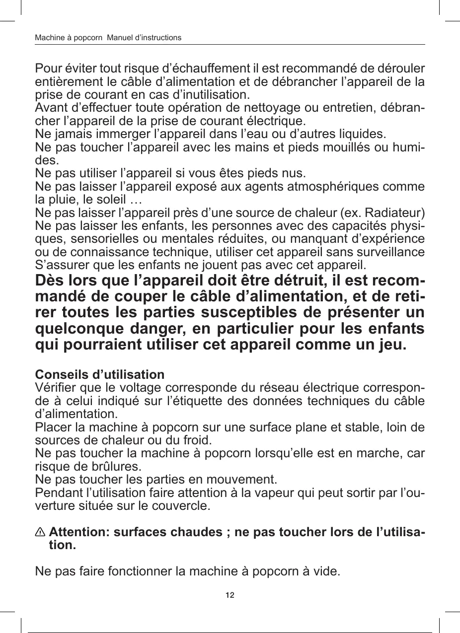 Ne pas toucher la machine à popcorn lorsqu’elle est en marche, car