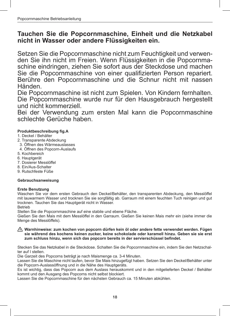 Setzen Sie die Popcornmaschine nicht zum Feuchtigkeit und verwen-