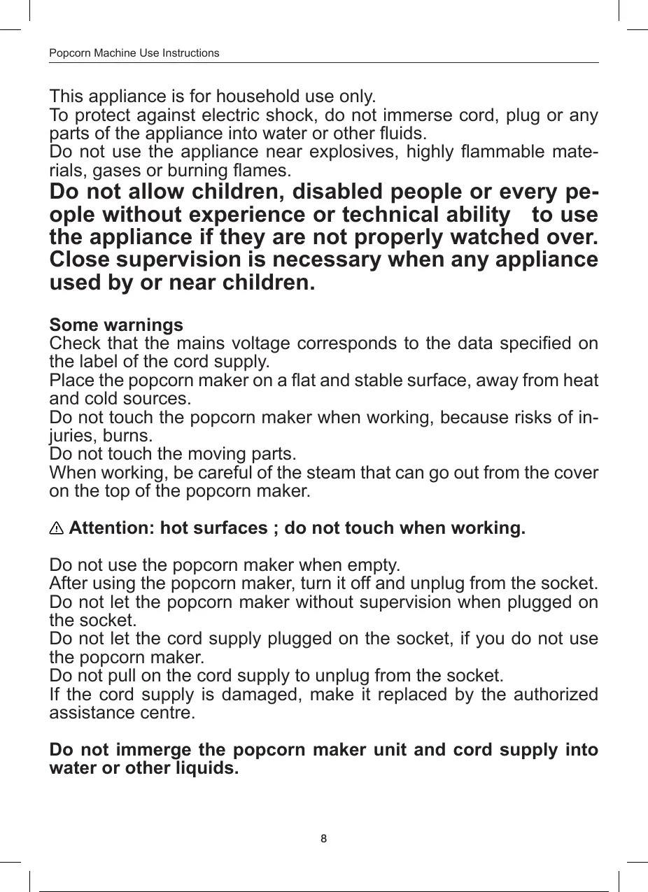 Do not let the popcorn maker without supervision when plugged on