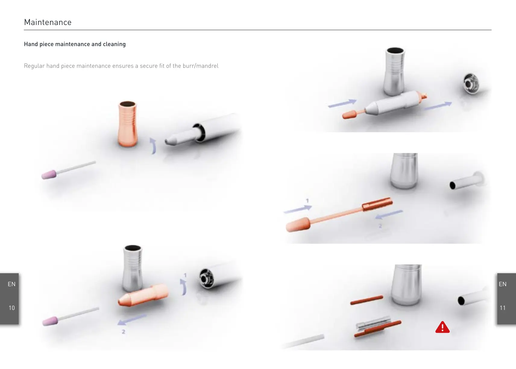 Regular hand piece maintenance ensures a secure fit of the burr/mandrel