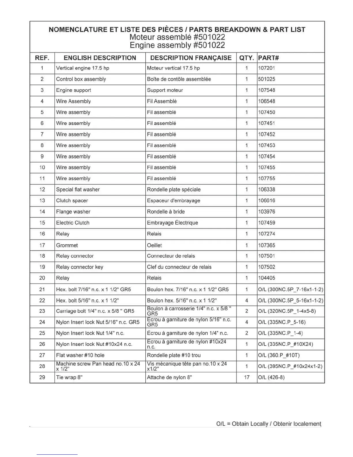 Bercomac 700714 - Engine Assembly Parts List