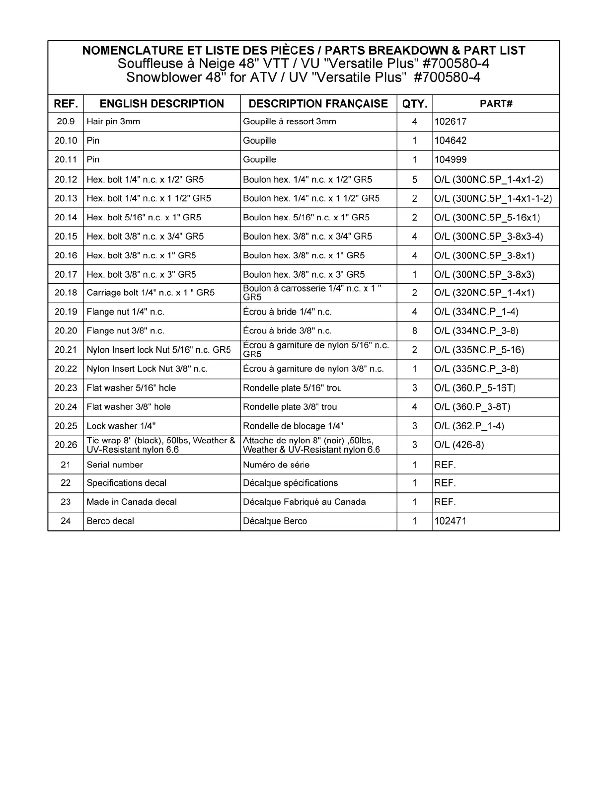 Les numéros ne sont pas disponibles pour la vente. Au besoin, veuillez commander les numéros de pièces séparément.