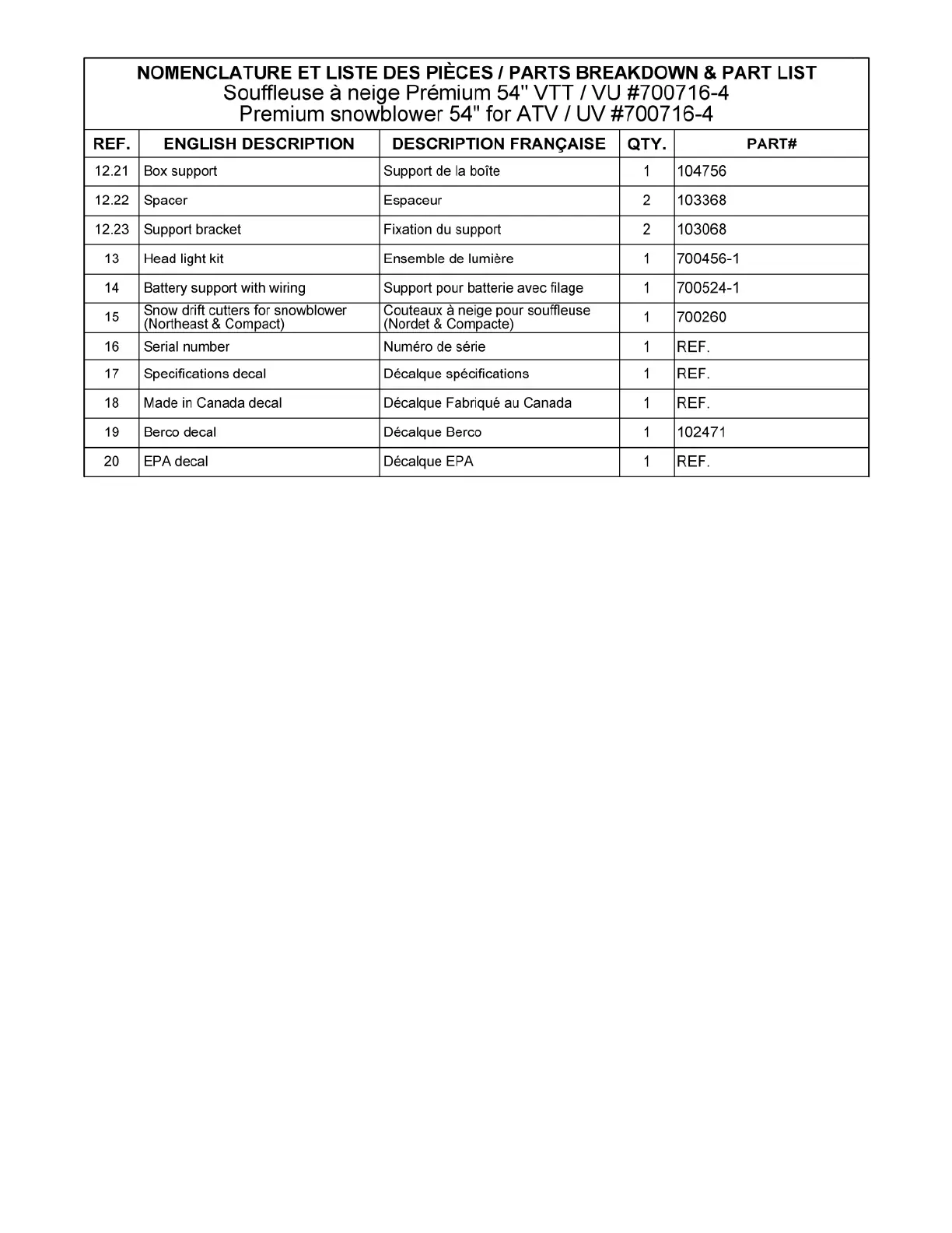 Les numéros ne sont pas disponibles pour la vente. Au besoin, veuillez commander les numéros de pièces séparément.