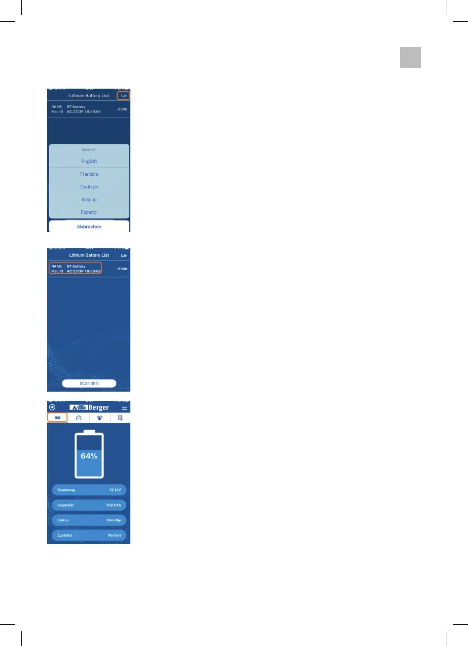 De afzonderlijke pagina‘s van de Berger BT Lithium App: