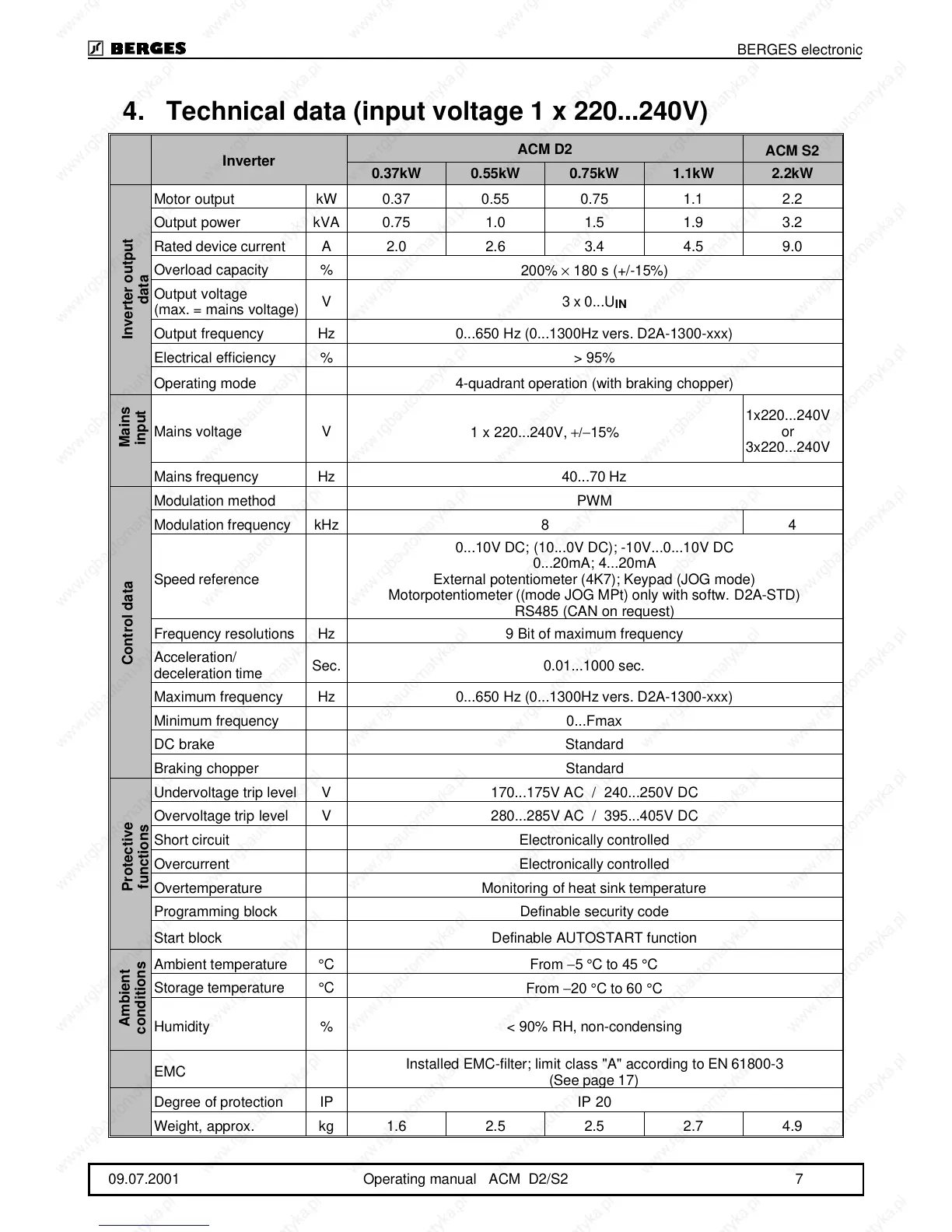 4. Technical data (input voltage 1 x 220...240V)