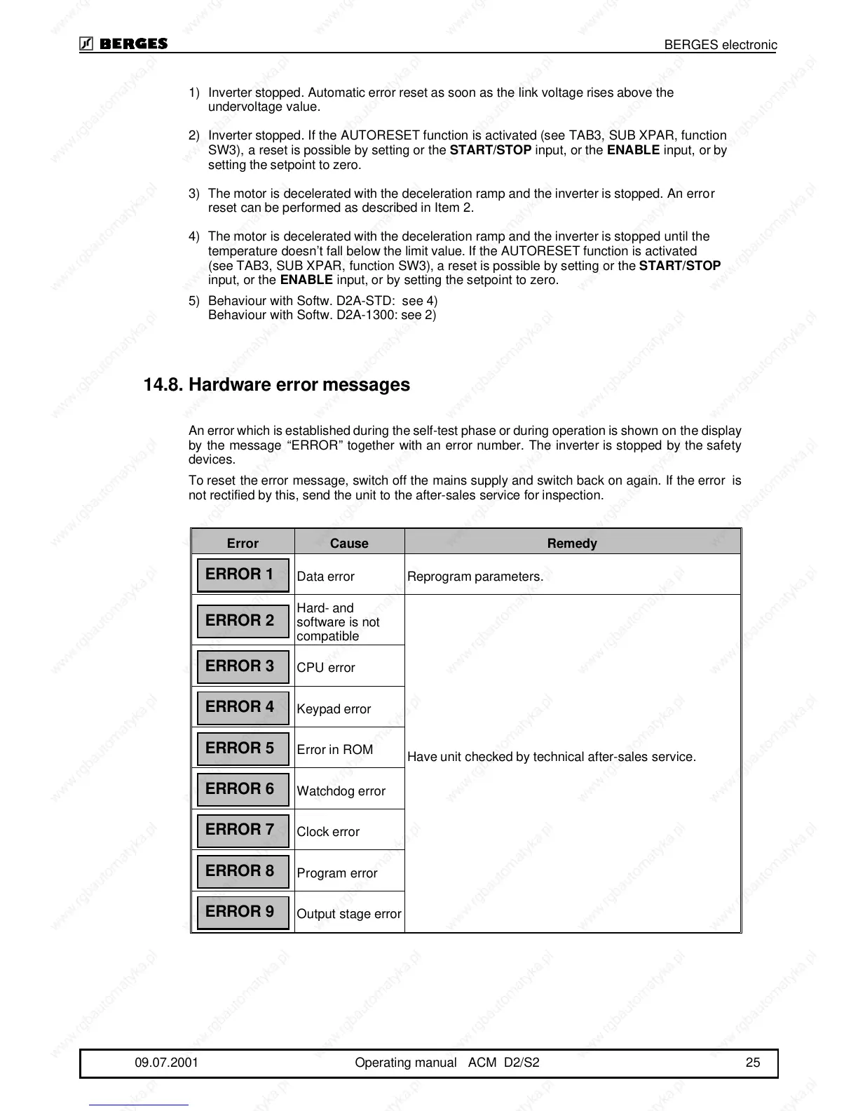 by the message “ERROR” together with an error number. The inverter is stopped by the safety
