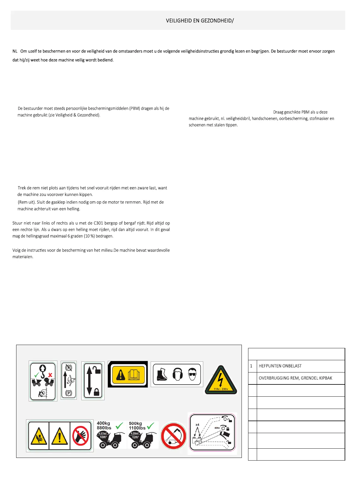 Als u twijfels hebt over het veilig en correct gebruik van de C301-machine, raadpleeg dan uw overste of C301