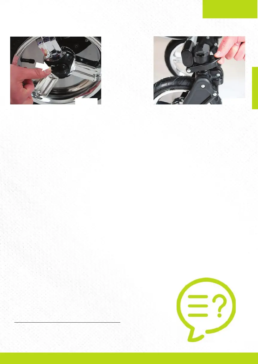 To remove the wheels, pull them o the axles while simultaneously pressing the locking knob