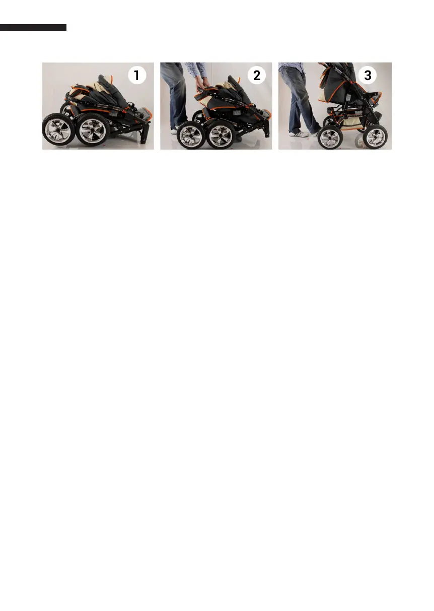 Na rozloženie kočíka musíte nohou zatlačiť na zadnú nápravu a držadlo potiahnuť dohora, až kým poistka