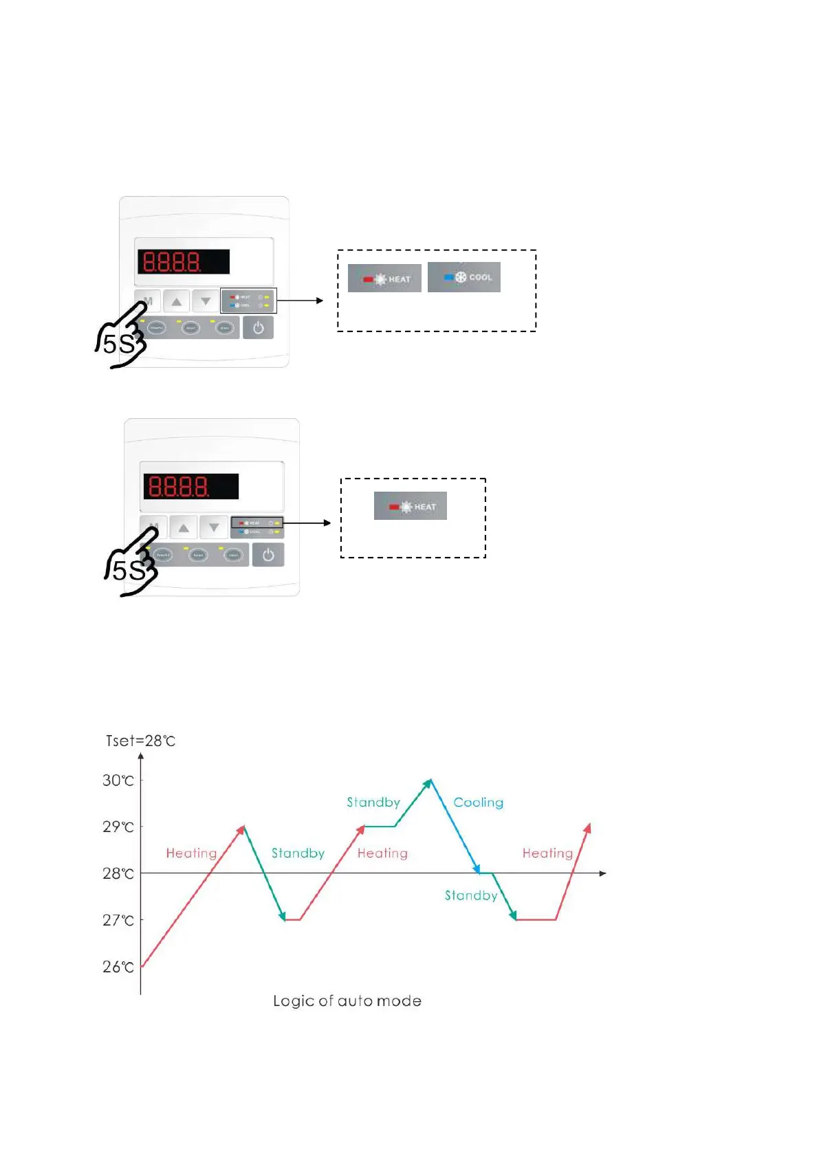 U kunt de verwarmingsmodus en de automatische modus inschakelen door gedurende 5 seconden op te