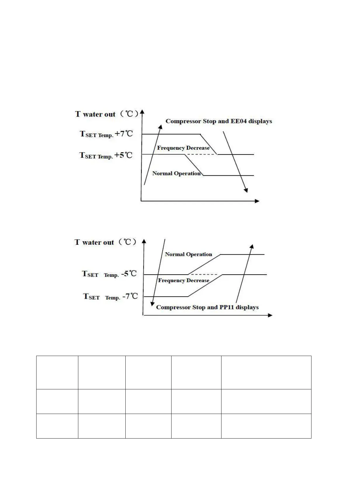 2. In cooling mode, if the water out temperature is lower than the set temperature over 7, LED