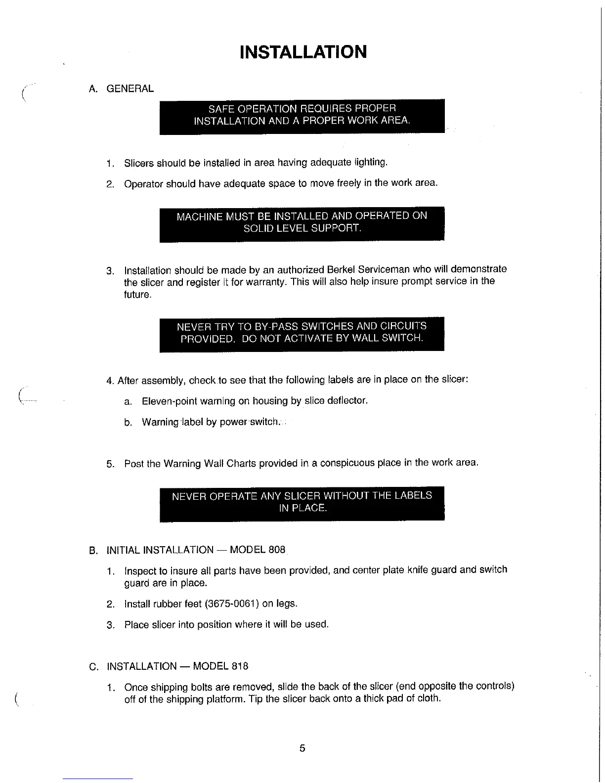 Berkel 818 - Installation Procedures; General Installation Guidelines; Model 808 Initial Installation; Model 818 Installation