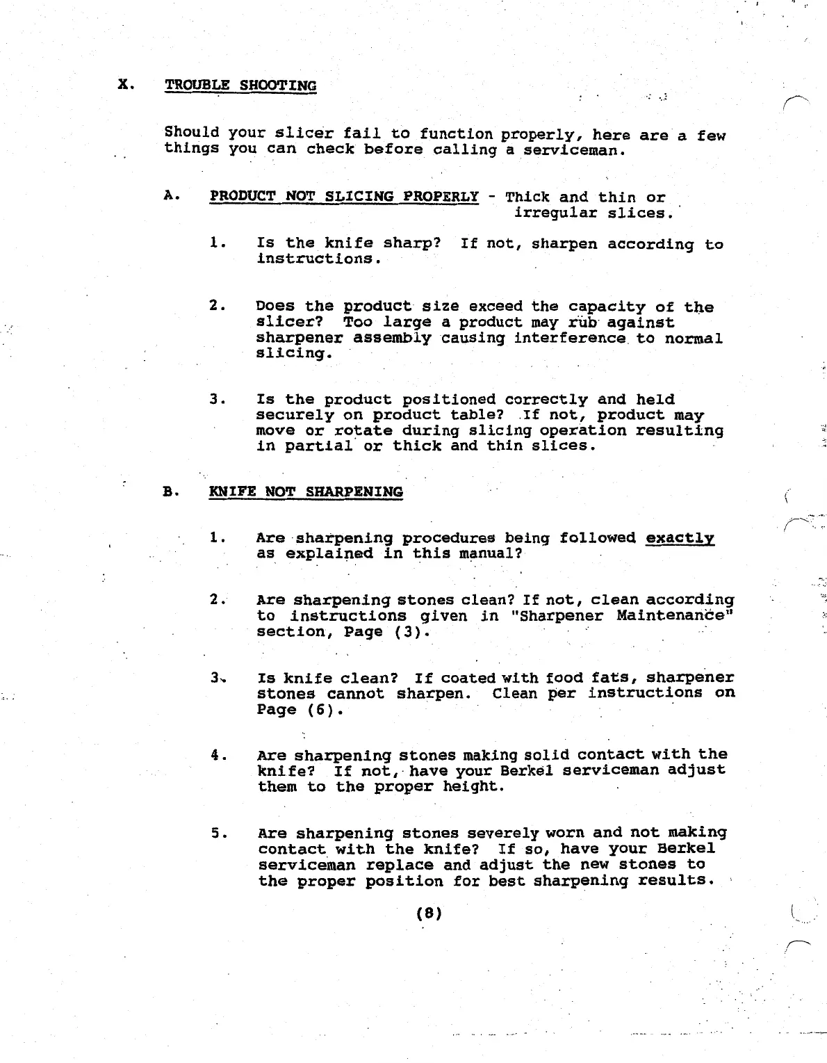 Berkel 823 - Trouble Shooting; Product Not Slicing Properly; Knife Not Sharpening