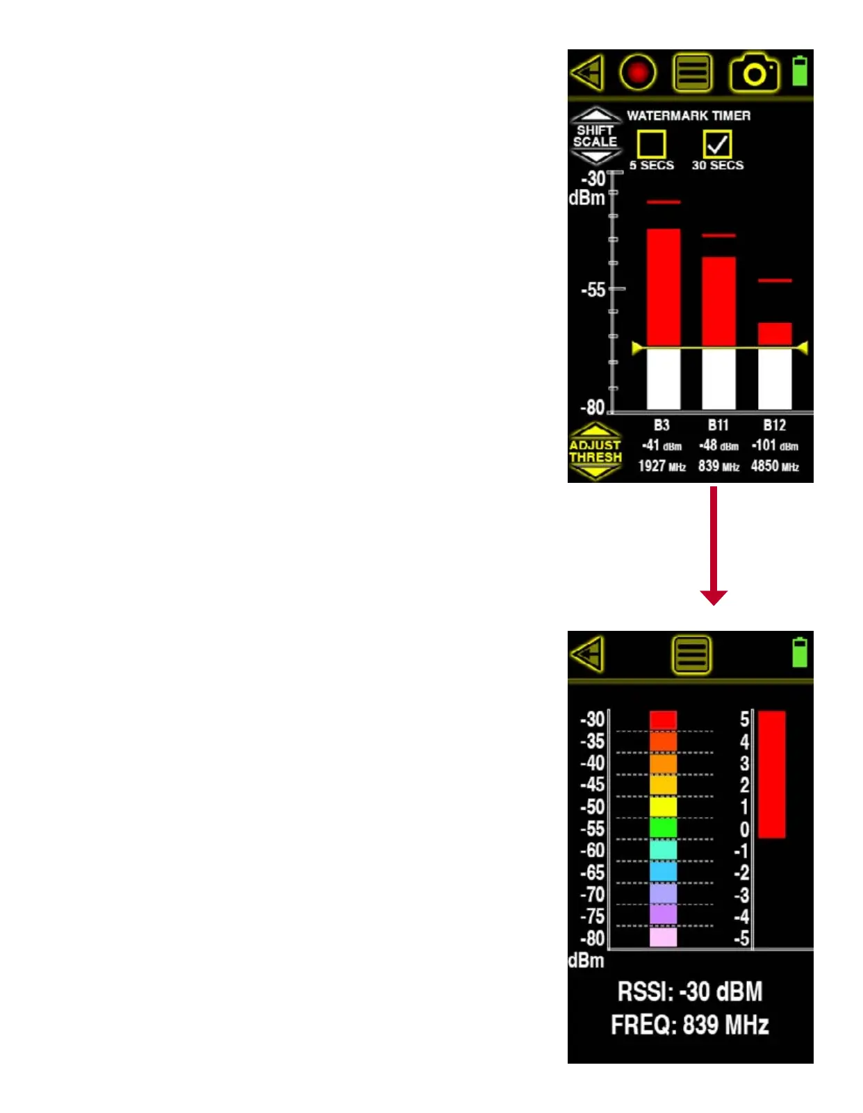utilize the scale to the right to view further signal strength details in dBm. The top half of this