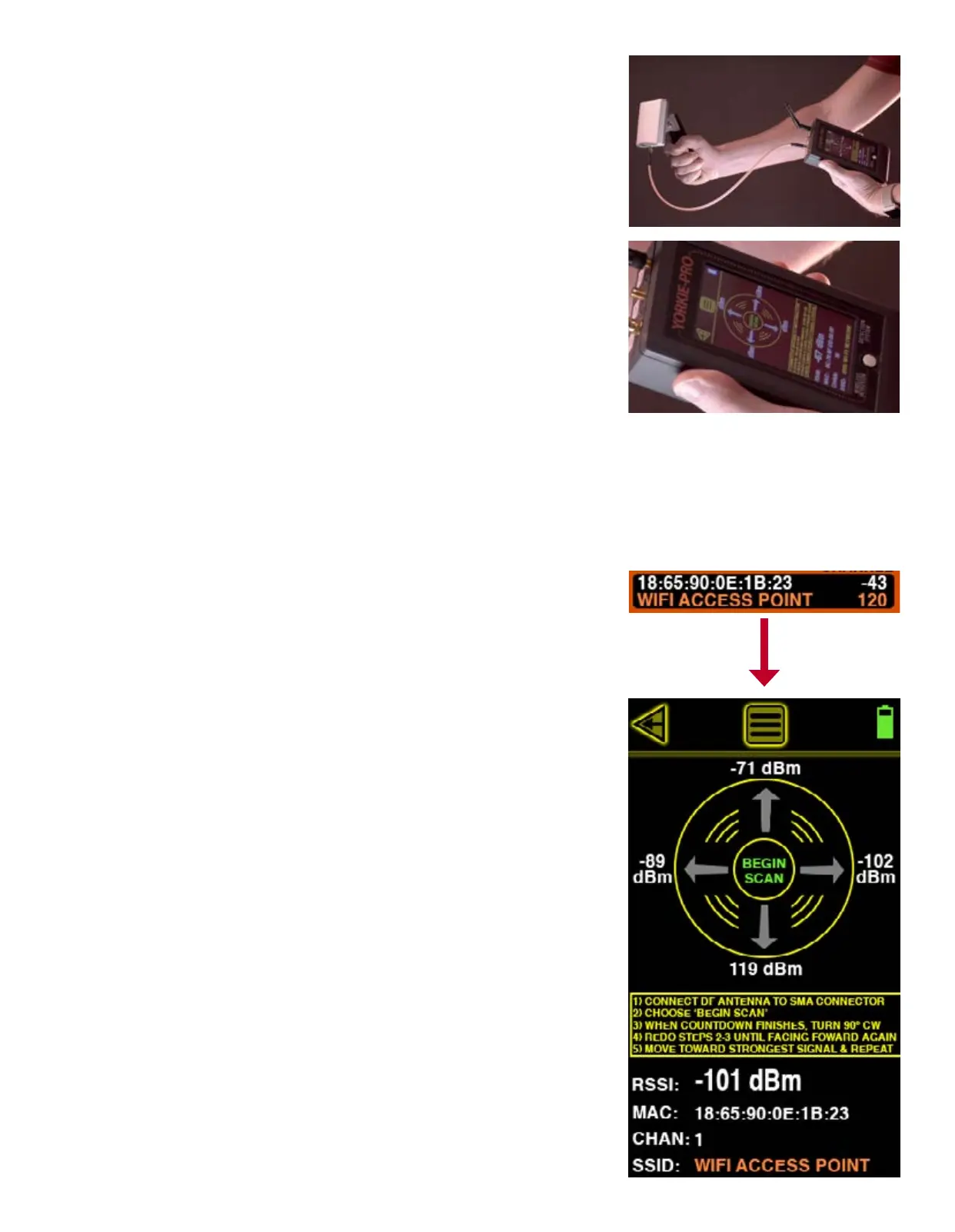 the SMA connector on the left side atop the Yorkie-Pro unit. BEGIN SCAN will continue to blink