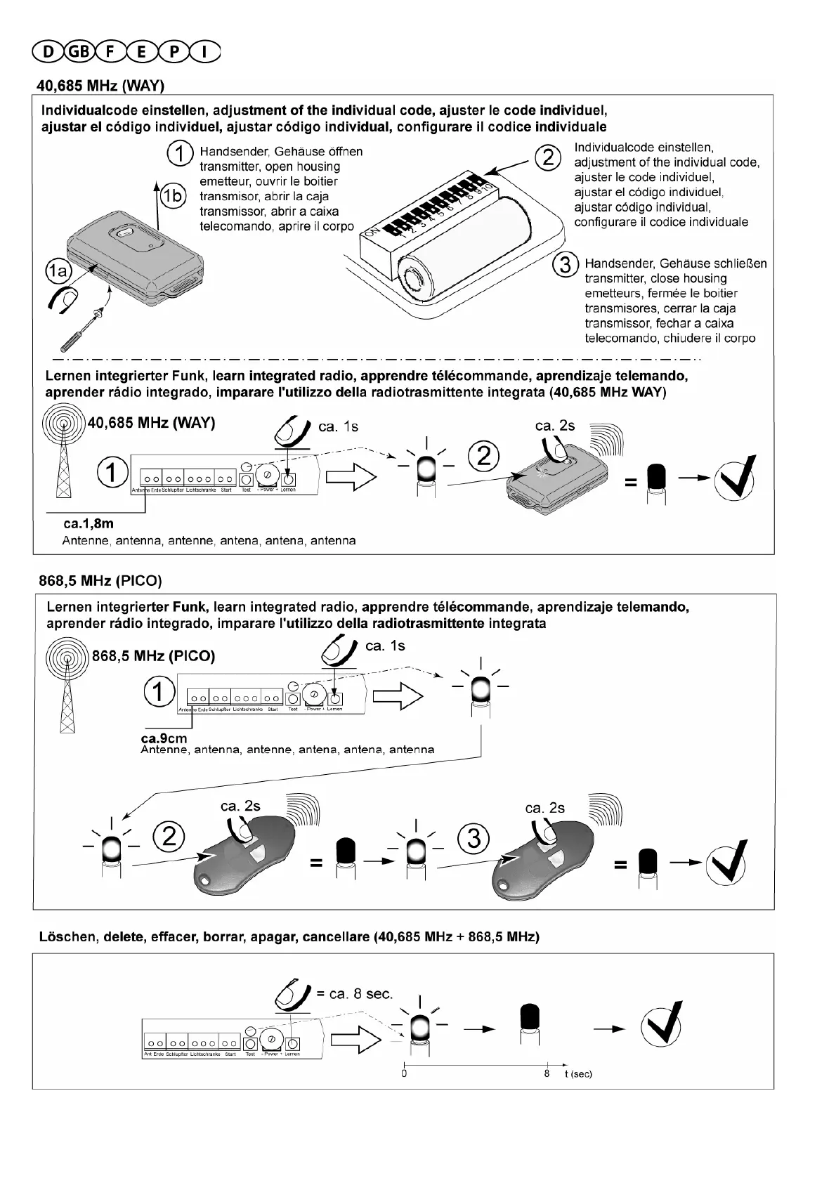 Bernal Rallye MC - 40,685 Mhz (Way);Adjustment of the Individual Code; 868,5 Mhz (Pico);Learn Integrated Radio; Delete (40,685 Mhz+868,5 Mhz)