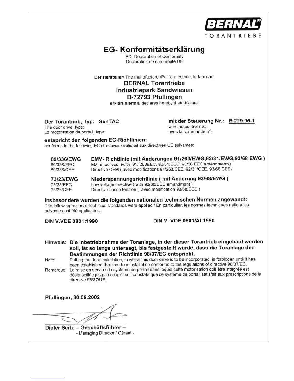 SenTAC D-GB-F Anhang / Appendix /Annexe V 09-2003