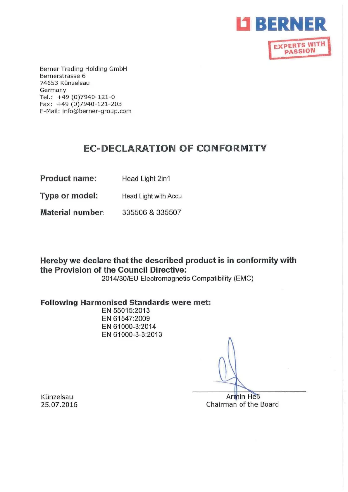 Berner 335507 - Declaration of Conformity; Product Identification; Conformity Statement; Harmonised Standards