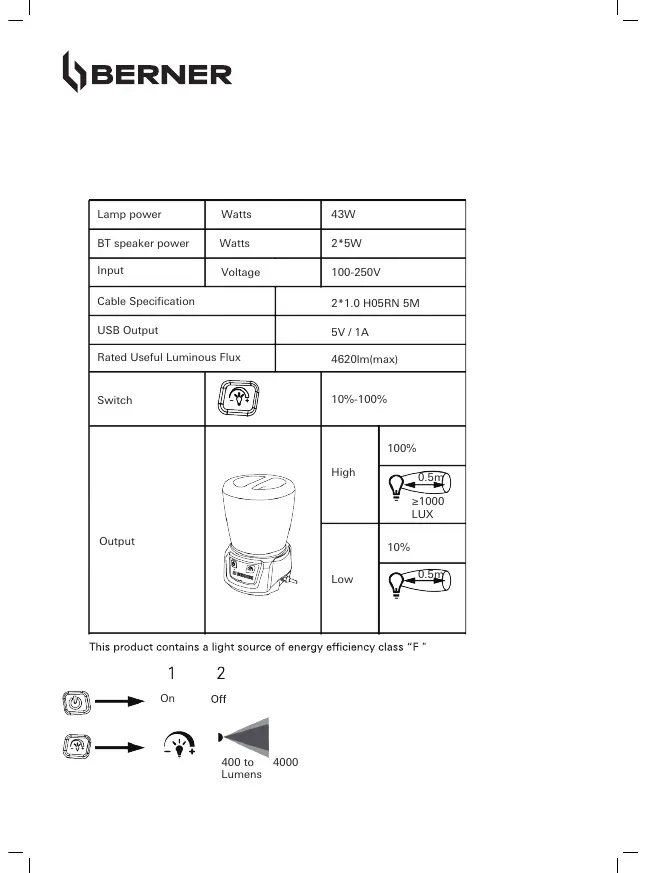 Berner 367233 - Lamp Technical Specifications; Power Ratings; Input and Cable Specifications; USB Output and Luminous Flux