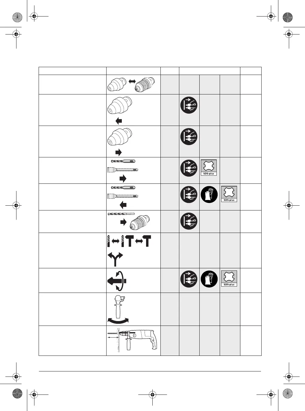 Donja tablica prikazuje radnje za montažu i rad električnog alata. Na prikazanoj slici pokazane su upute