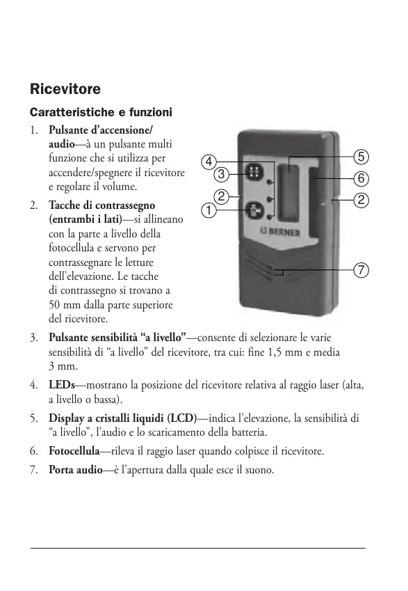 4. LEDs—mostrano la posizione del ricevitore relativa al raggio laser (alta,