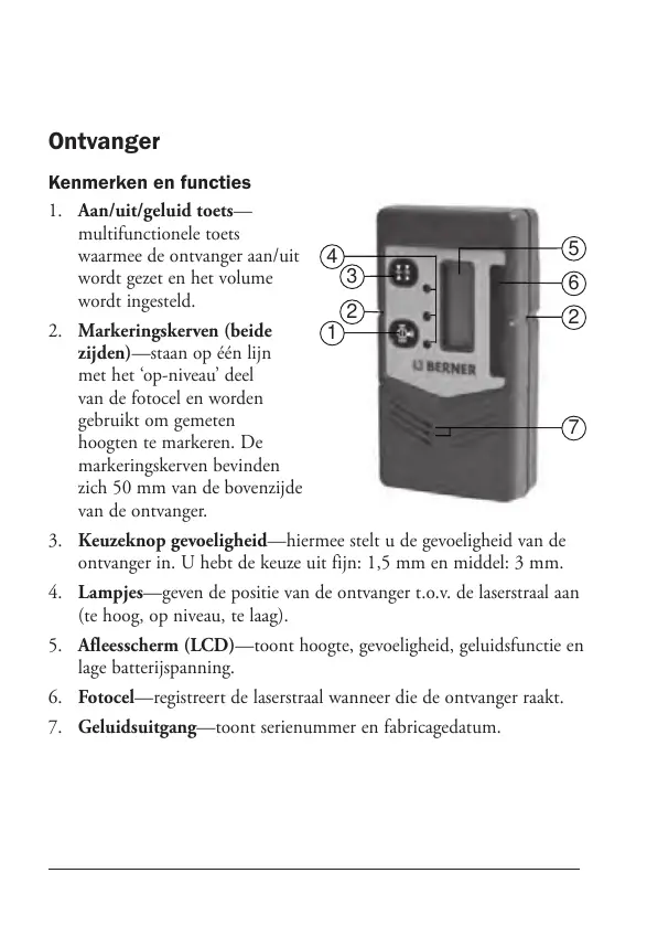 4. Lampjes—geven de positie van de ontvanger t.o.v. de laserstraal aan