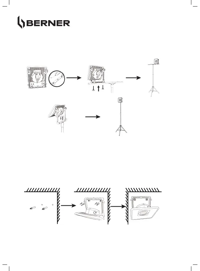 1. Zaznaczyć miejsca umocowania lampy. Wywiercić otwory montażowe. Przykręcić reflektor w