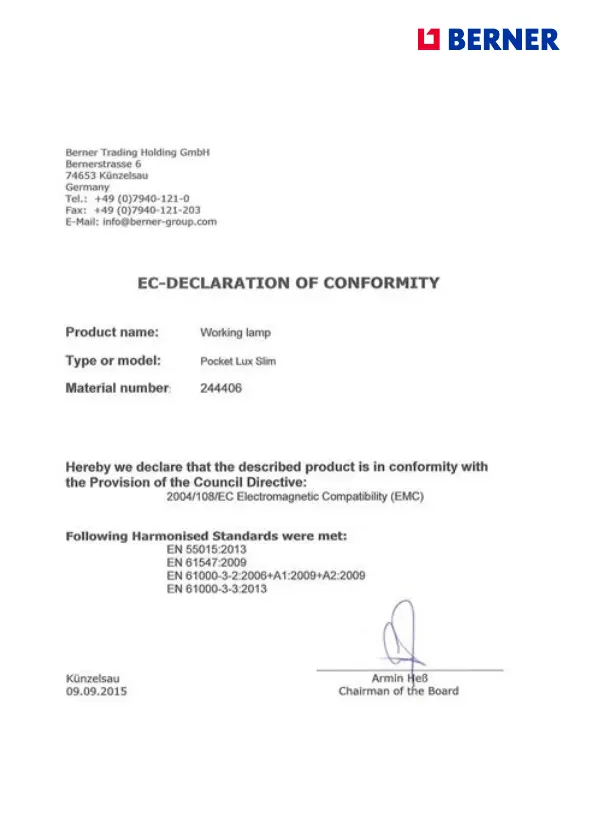 Berner Slim - EC Declaration of Conformity