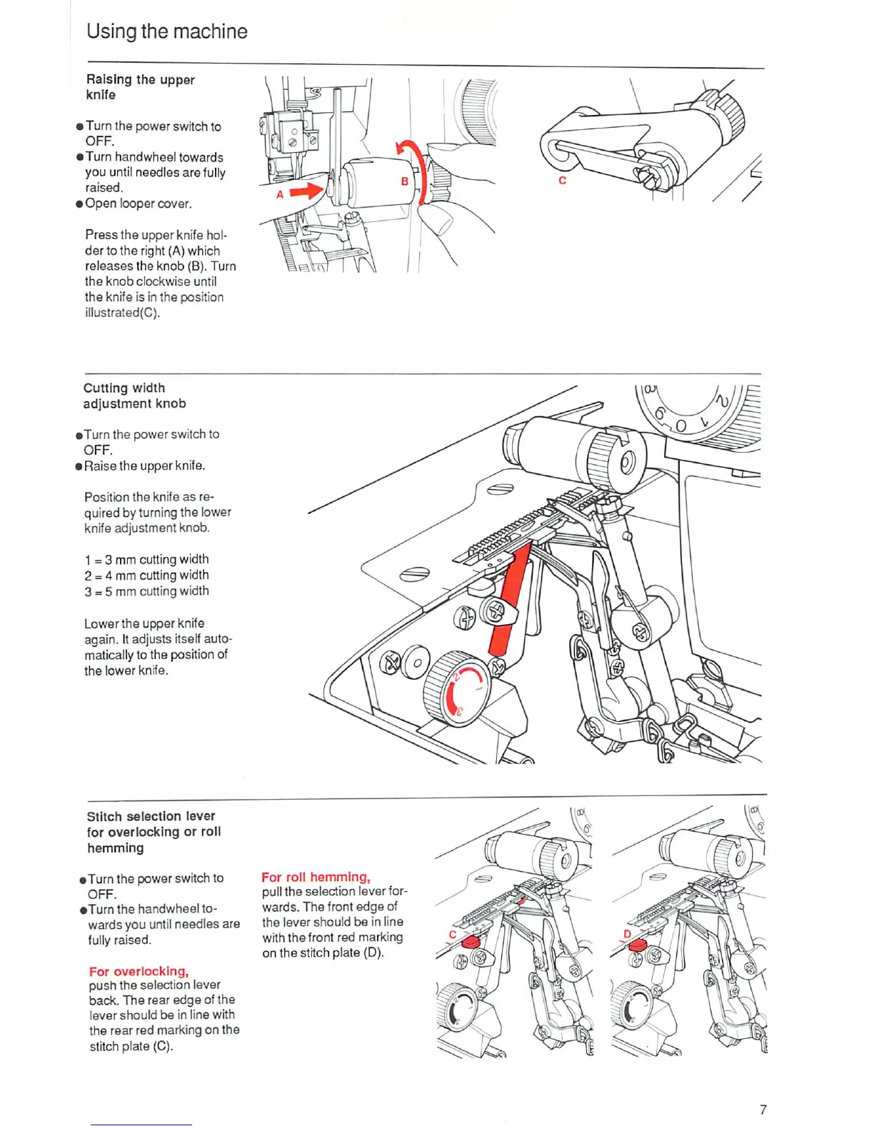 Bernette 335 - Machine Adjustments for Sewing; Raising the Upper Knife; Stitch Selection Lever