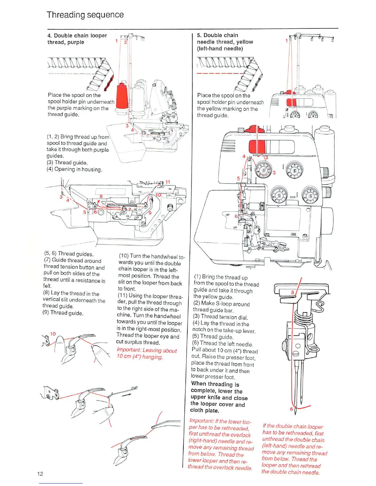Bernette 335 - Threading Sequence: Chain Stitch Threads; Double Chain Looper Thread (Purple); Double Chain Needle Thread (Yellow)