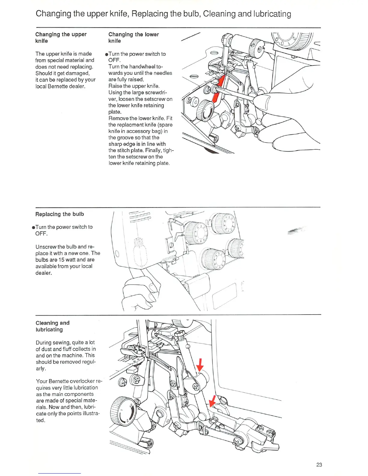 Bernette 335 - Changing the Upper Knife; Changing the Lower Knife; Replacing the Bulb; Cleaning and Lubricating