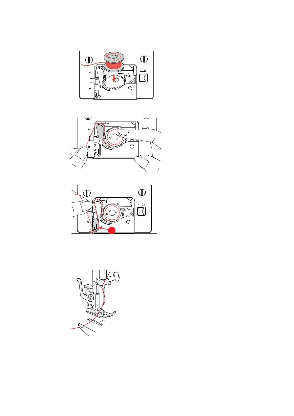 > Follow the arrow markings to bring the thread into the bobbin thread guide.